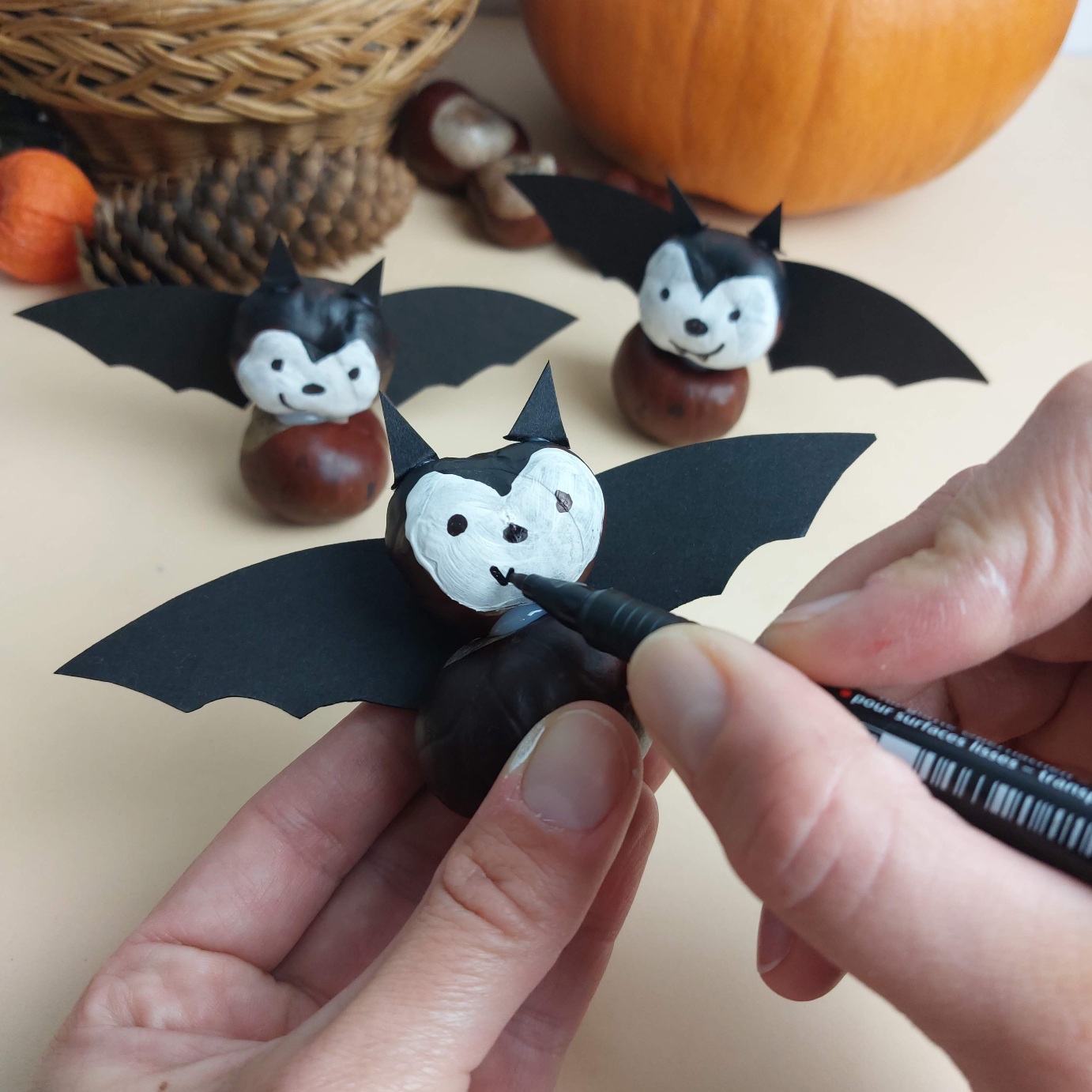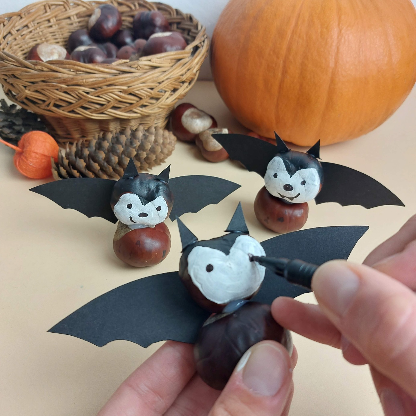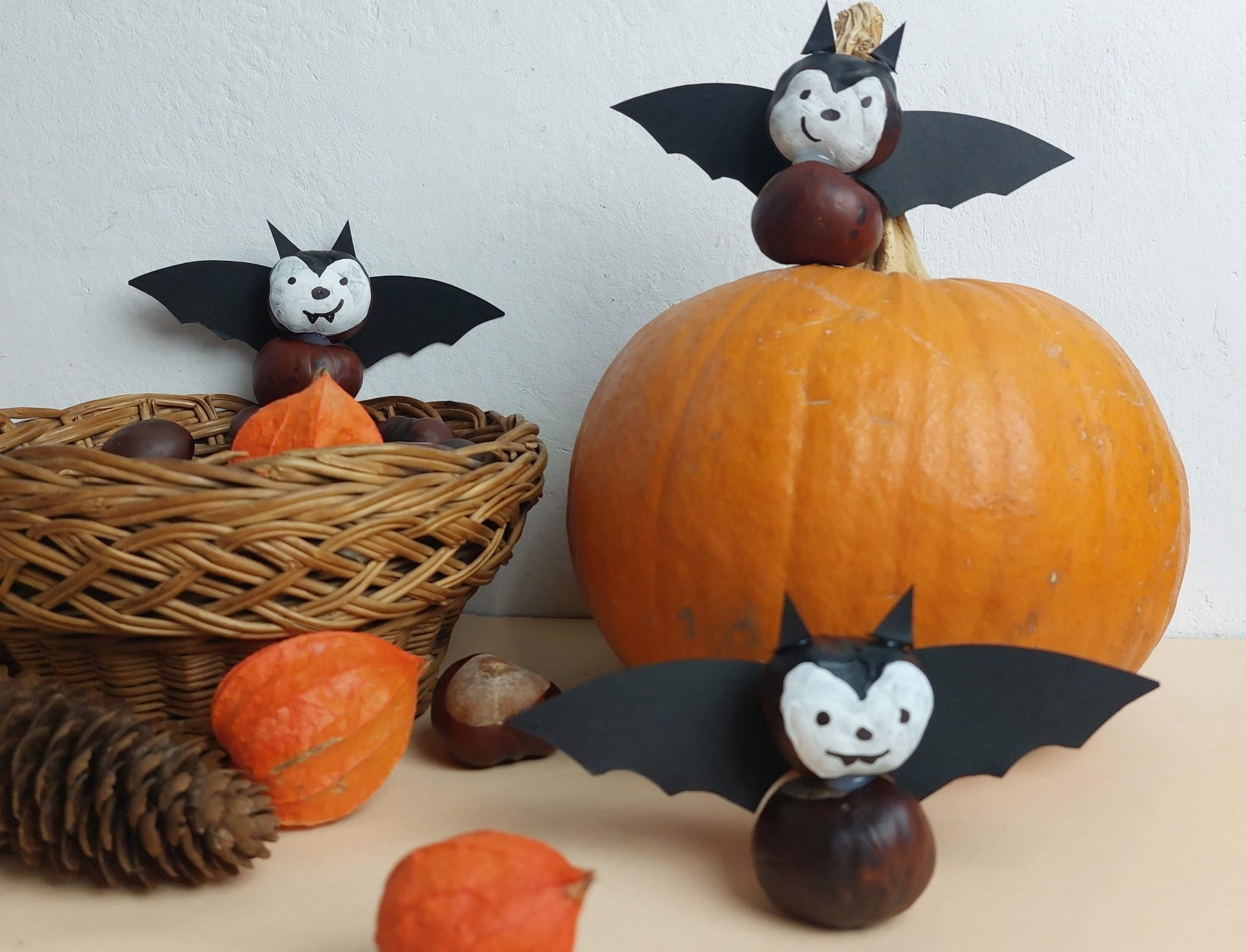 Az őszi dekorációk világába az utóbbi években szépen lassan a Halloweenhez kapcsolódó motívumok is beszivárogtak - még akkor is, ha magát az ünnepet nem feltétlenül tartjuk. Tökök, fekete macskák, boszorkányok, baglyok és mókás szellemek bukkannak fel mindenfelé, így a gesztenyefigurák között is helyet kaptak. Mi játékos kis denevéreket varázsoltunk kedvenc alapanyagunkból - egy kis festékkel és papír- vagy filcszárnyakkal könnyen elkészíthetőek, és garantáltan feldobják a hangulatot az ablakpárkányon vagy a gyerekszoba polcán.