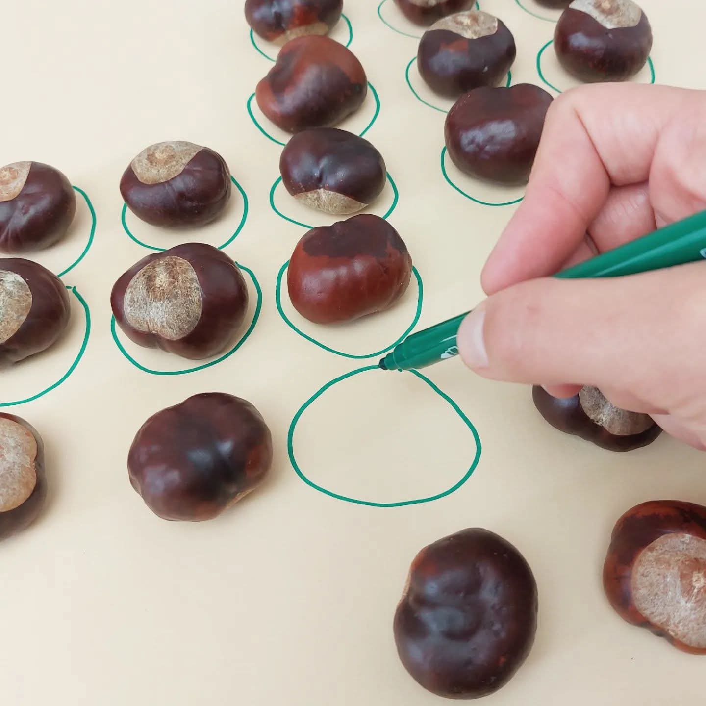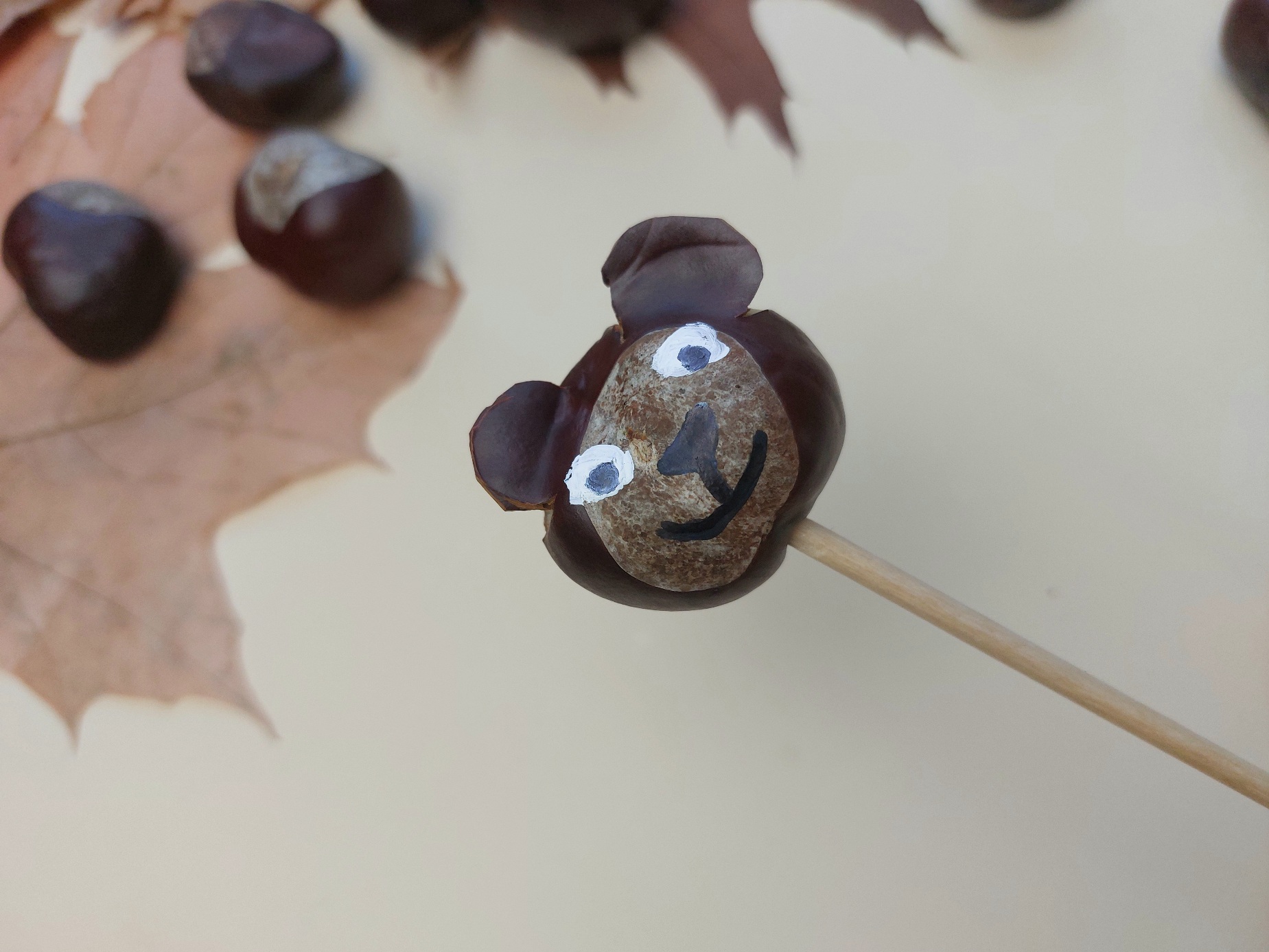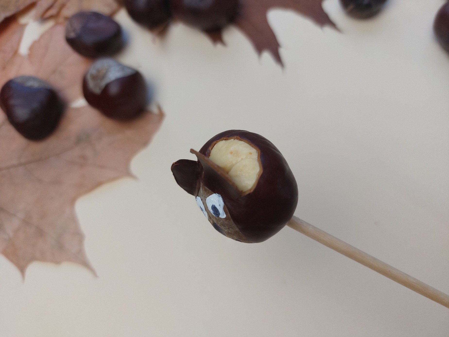 A gesztenye előfúrásához egy vékony szög vagy vastag zsákvarrótű is jó szolgálatot tehet: ezzel óvatosan kilyukaszthatjuk a héjat, így a fogpiszkálót könnyebben bele tudjuk szúrni. Ha hurkapálcát használunk, egy ár még praktikusabb lehet a nagyobb lyukak kialakításához. A szemeket akrilfestékkel, akrilfilccel vagy POSCA markerrel könnyen megrajzolhatjuk vagy megfesthetjük, a papírból, filcből vagy kartonból készült testrészeket pedig érdemes ragasztópisztollyal rögzíteni. Alternatív megoldásként sniccerrel finom bemetszést ejthetünk a gesztenyén, és ebbe is becsúsztathatjuk a kisebb elemeket.